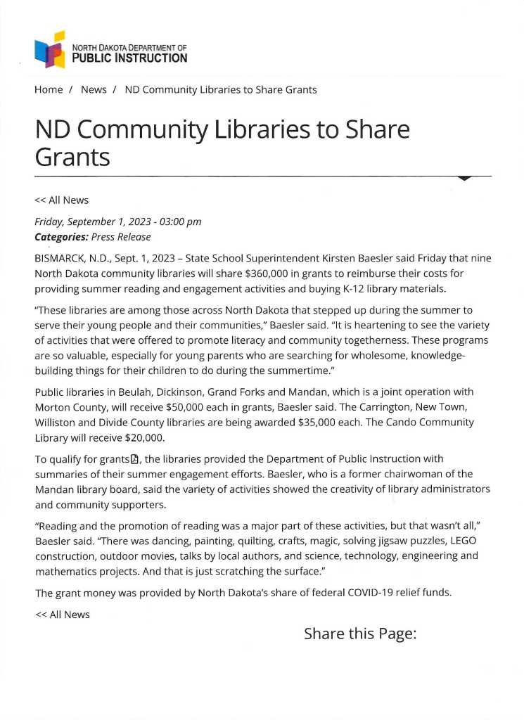 We are so EXCITED! We have some AMAZING NEWS to share for The New Town City Library and other surrounding Libraries in North Dakota! Please read the article below!!!!