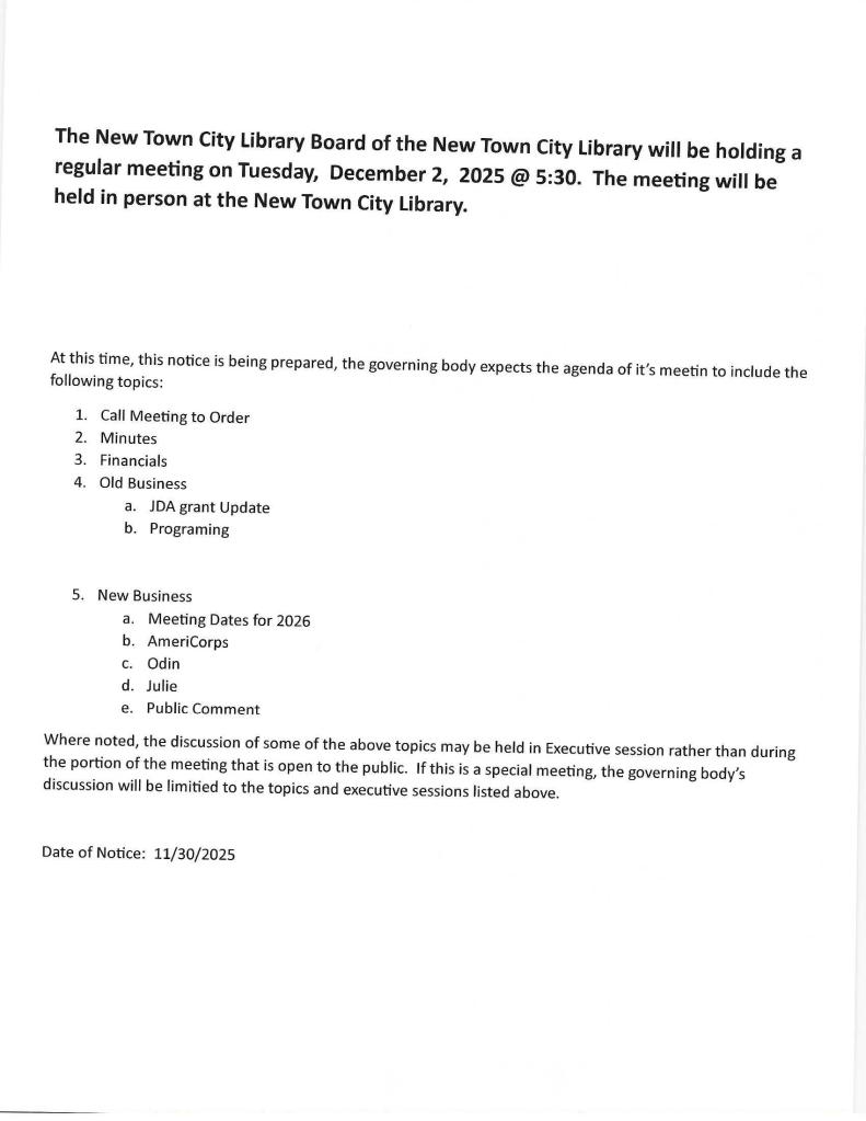December 1, 2025 newtowncitylibrary December 2025 Library Board Meeting Share: Click to email a link to a friend (Opens in new window) Email Tweet Click to print (Opens in new window) Print Share on TumblrLike Loading... Related