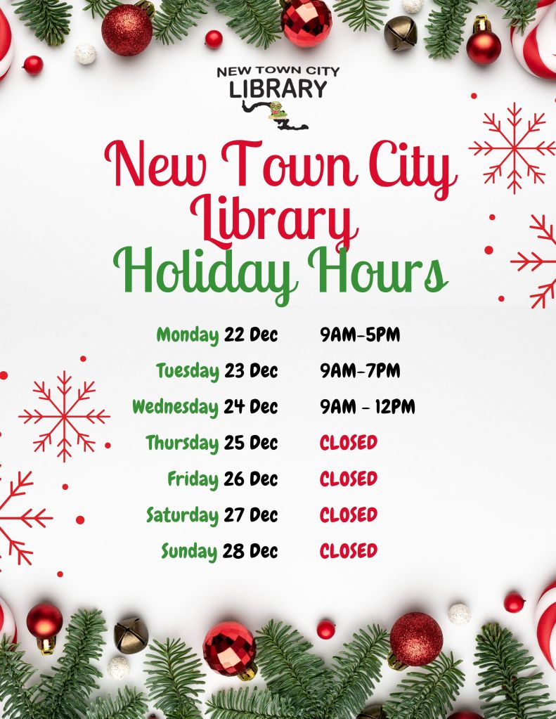 December 18, 2025December 18, 2025 newtowncitylibrary 2025 Holiday Hours Share: Click to email a link to a friend (Opens in new window) Email Tweet Click to print (Opens in new window) Print Share on TumblrLike Loading... Related